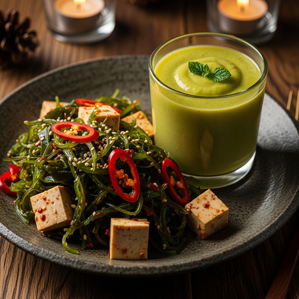 Vibrant Korean Lunch: Spicy Seaweed & Tofu Salad + Mango Green Smoothie