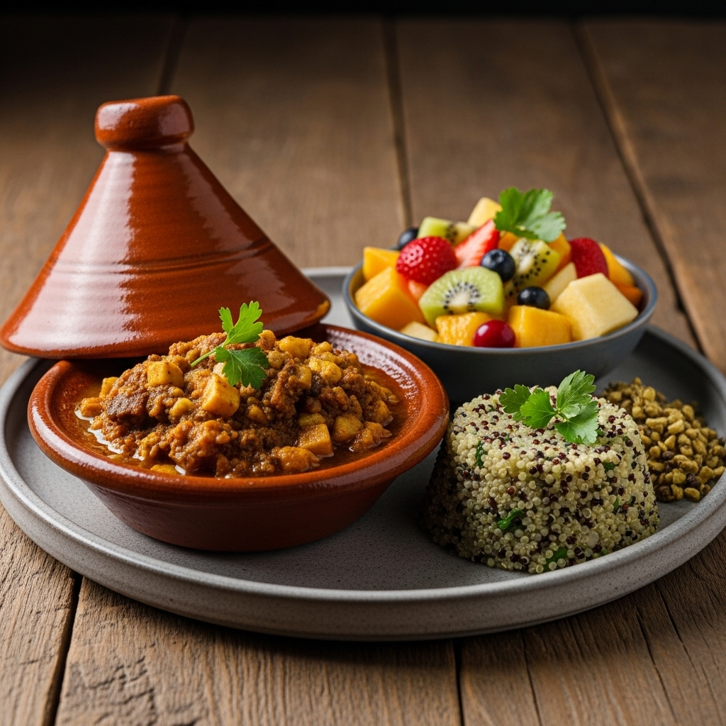 Intermediate๐ โMoroccan Vegan Breakfast Feast: Aromatic Tagine & Herb-Infused Quinoa with Fresh Fruit SaladโCookJunkieMoroccanBreakfastVegan