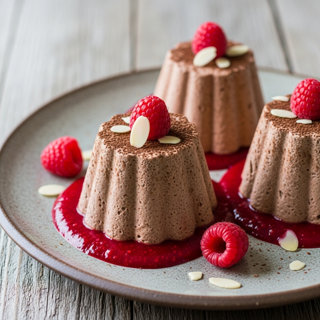 IntermediateAlmond-Chocolate Frozen Mousse Towers with Raspberry CoulisCookJunkieItalianDessertDairy Free
