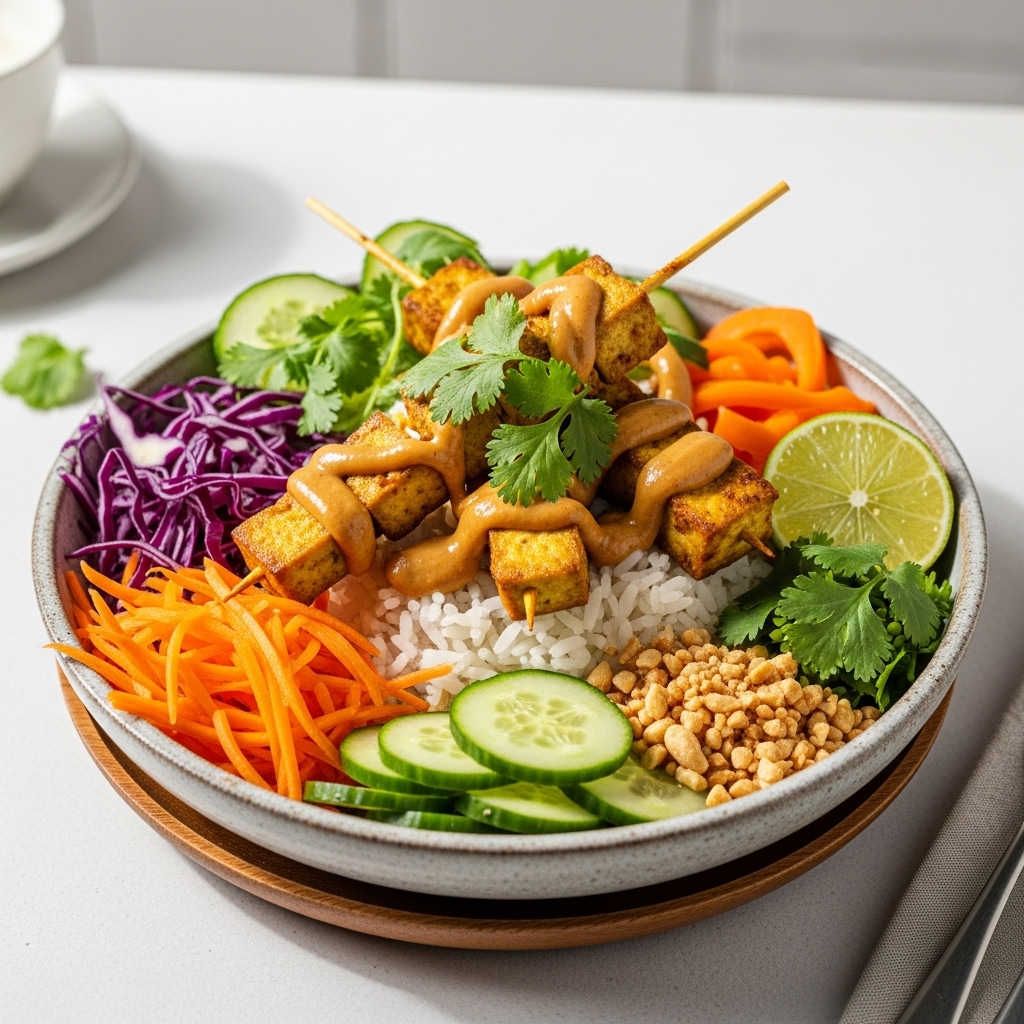 IntermediateVegan Indonesian Rice Bowl with Tofu Satay, Peanut Sauce, and Crunchy VegetablesCookJunkie