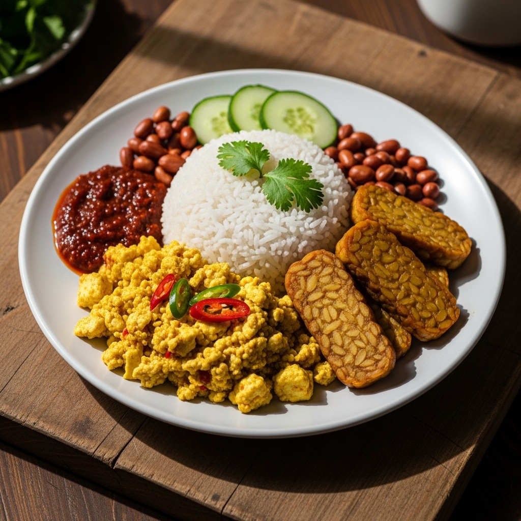 IntermediateCinematic Vegetarian Malaysian Breakfast Nasi Lemak with Tofu Scramble & Crispy TempehCookJunkie